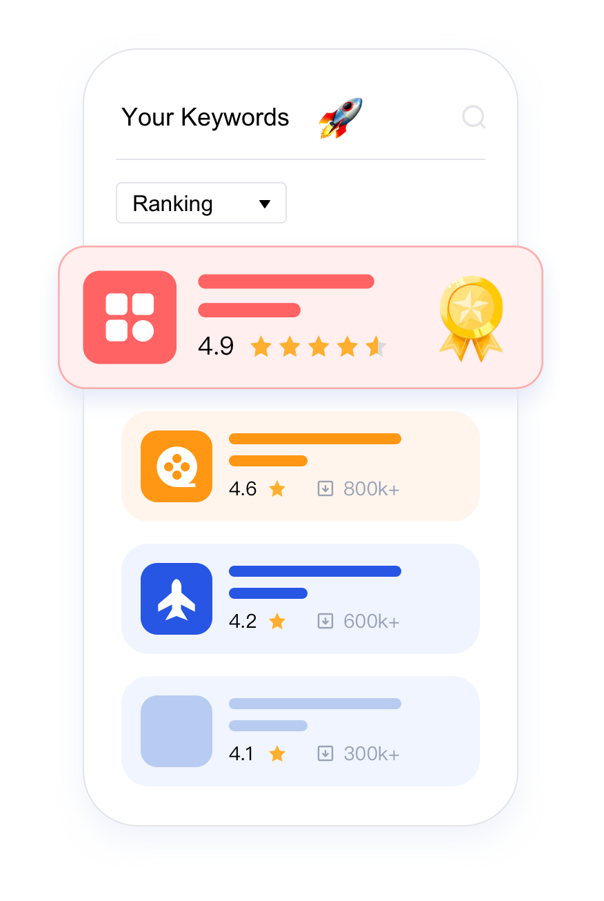- Guaranteed app keyword positions in #Top 1-5, keep on promotion and stick ranking results.